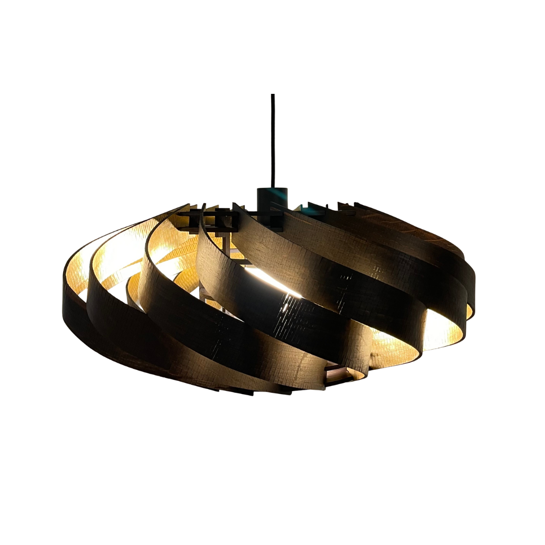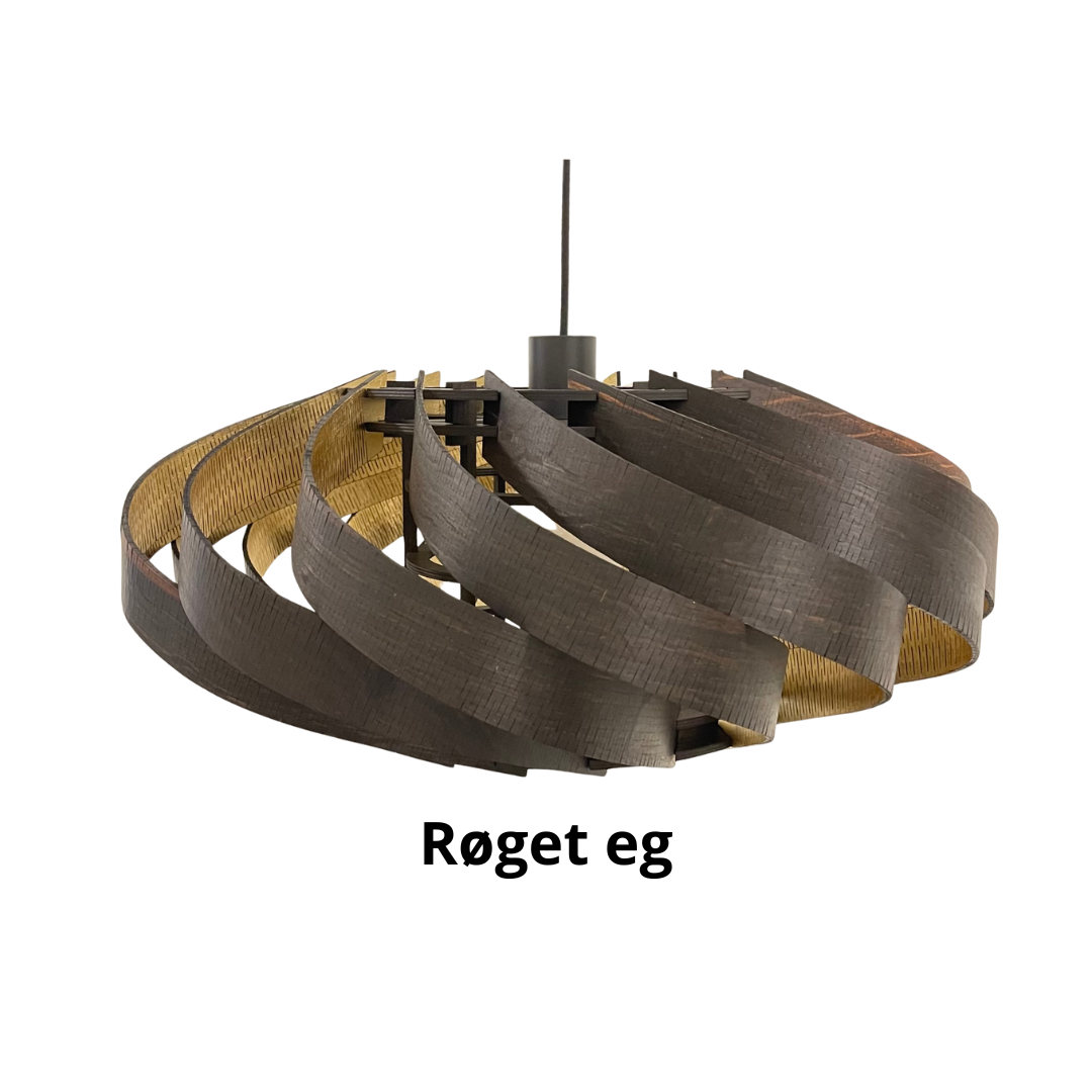 De 16 bøjede trælameller i røget egetræ skaber et fascinerende spil af lys og skygge, hvilket giver en behagelig og varm belysning.